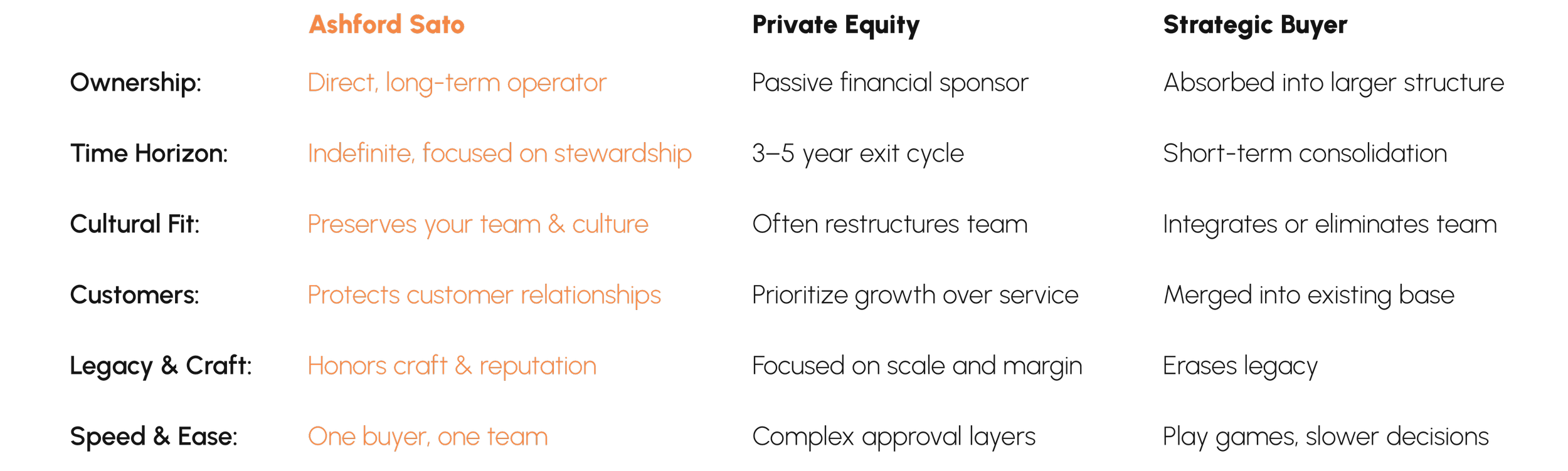 We aren’t private equity flippers and we aren’t your market rivals looking to swallow you whole.